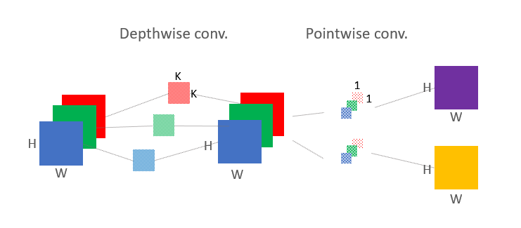 Depathwise convolution에서 C 갯수만큼의(보통 RGB 3장) 사이즈 K^2 필터가 있고 각각의 채널에 각각 컨볼루션 적용